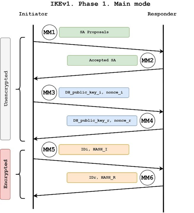 There are 2 phases and modes in IKEv1. Phase-1 is known as Main Mode and Phase-2 is known as Quick Mode. There is a total of 9 messages that get exchanged in IKEv1 out of which 6 messages get exchanged in Phase-1 (Main Mode) and the remaining 3 messages get exchanged in Phase-2 (Quick Mode).