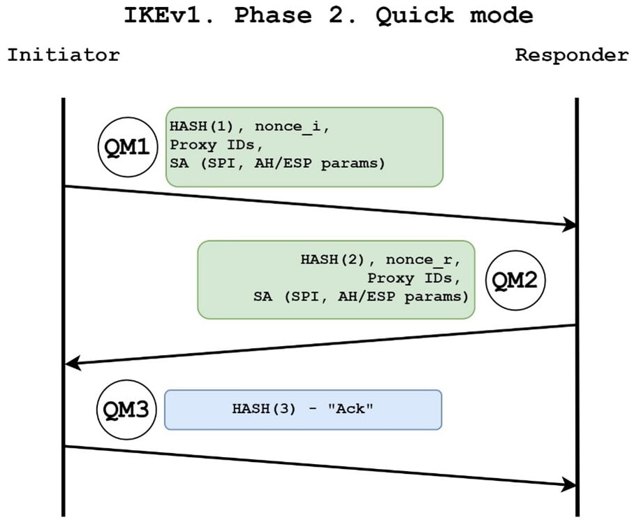Quick Mode Message-3: Once the parameters match on both ends for data plane traffic exchanged in Quick Mode Messages 1 and 2, the initiator sends a message to start the data plane traffic. This message is also encrypted. After these 3 messages of Quick Mode, User traffic can be sent over an IPSEC tunnel using the parameters NEGOTIATED IN Quick Mode.