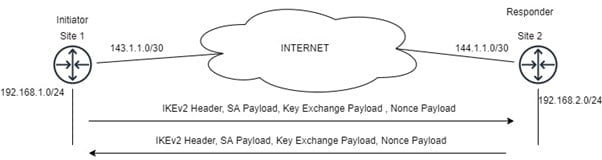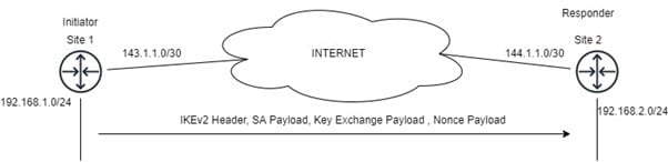 IKE_SA_INIT_Request: – The first message is sent from Initiator to a responder. This message is used to negotiate the encryption and hashing algorithm in Security Association Payload and Public Parameter of Diffie Hellman in Key Exchange Payload and Nonce Payload.